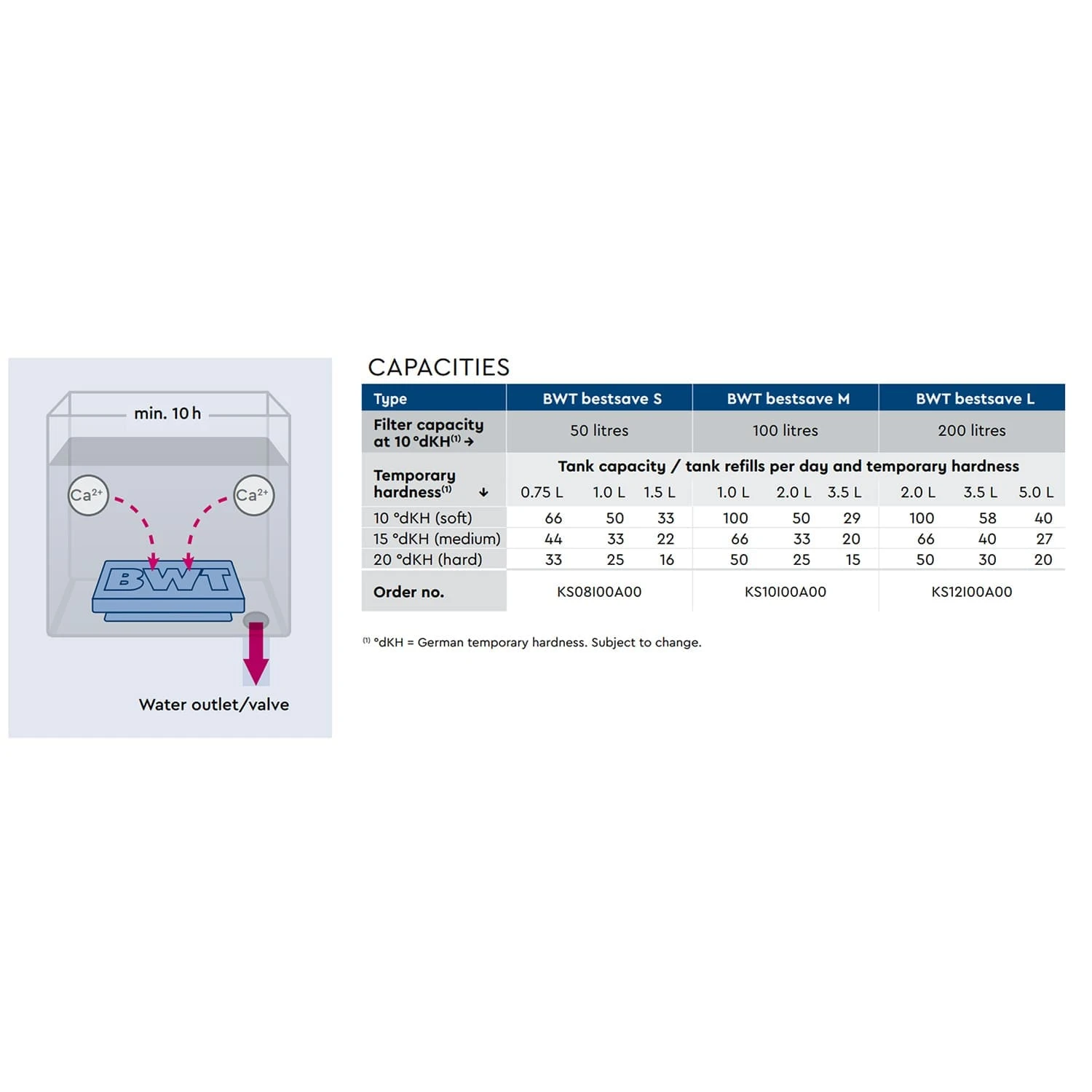 It is recommended to exchange the filter after a maximum of two months. Capacity @ 10° dkh (litres) – 100.