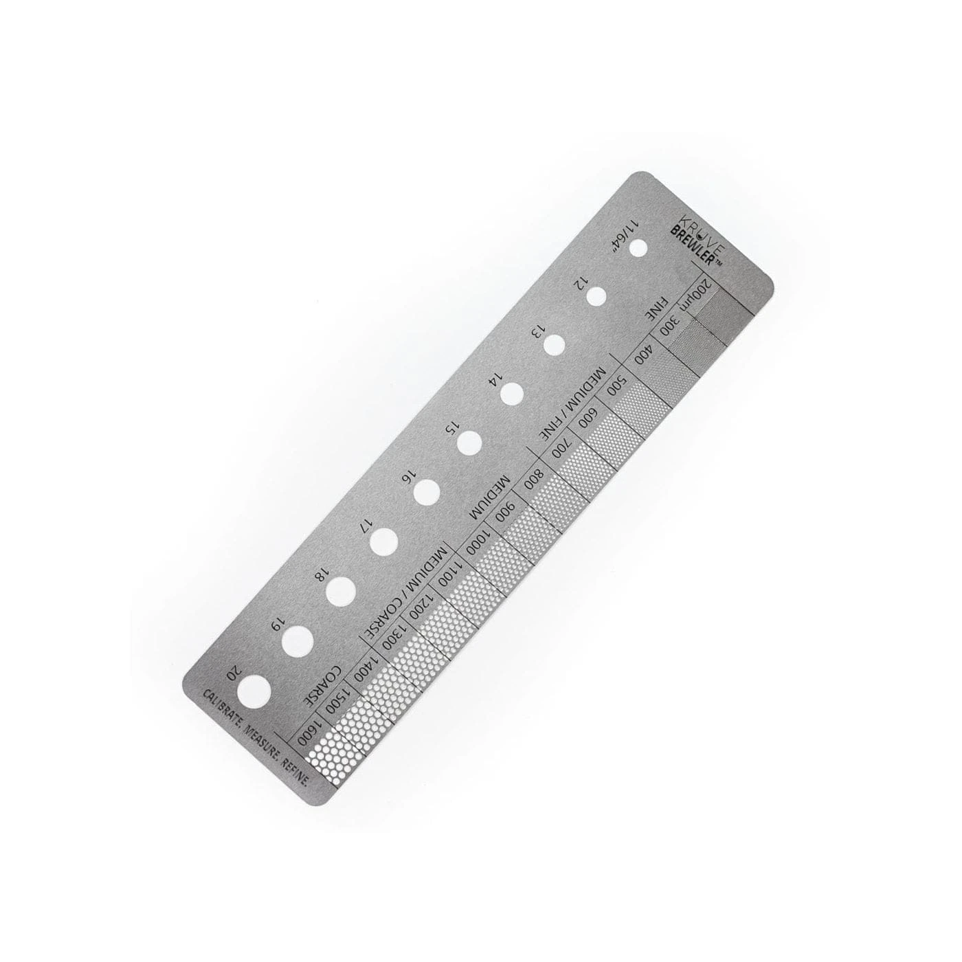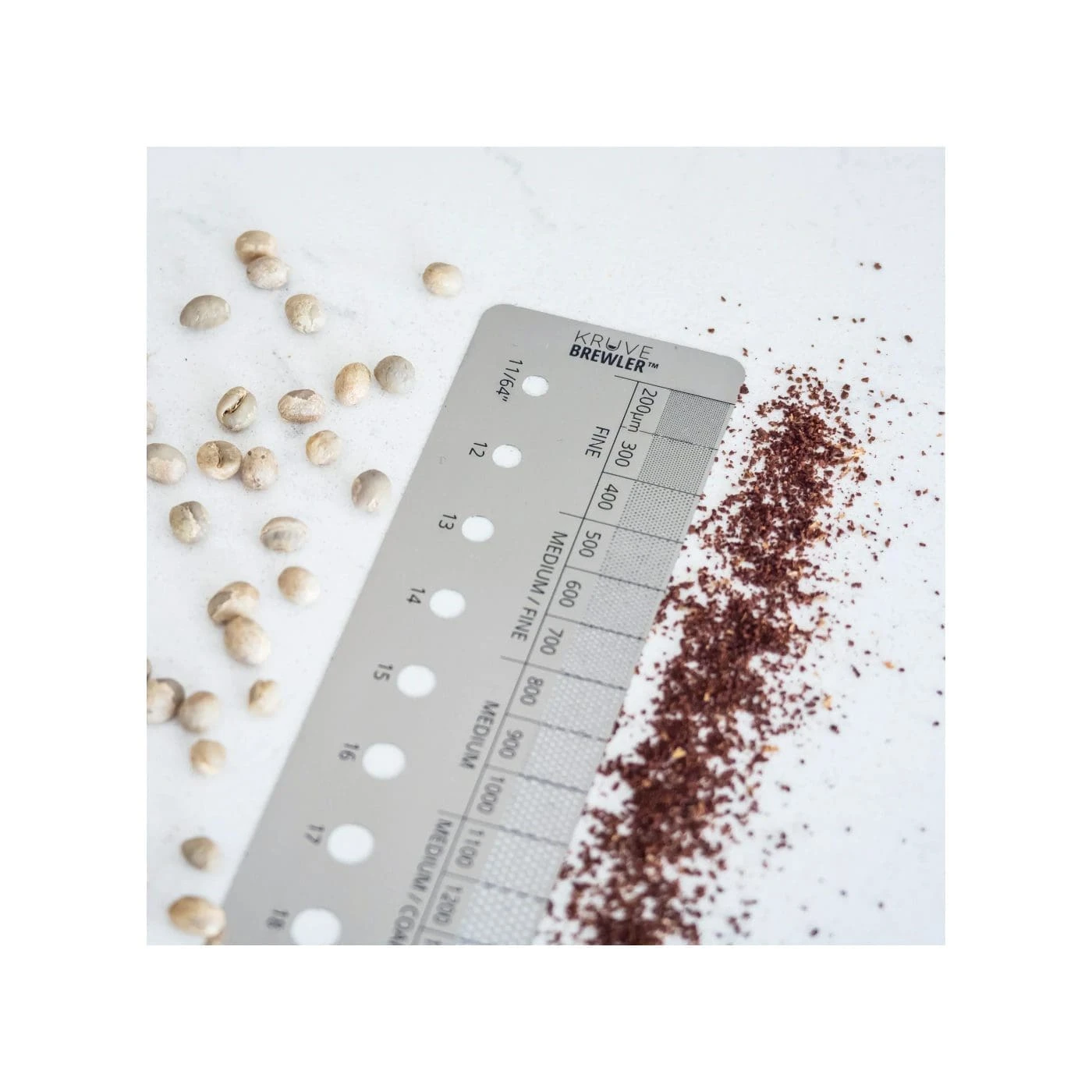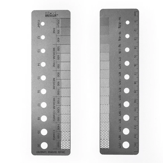 The BREWLER is a handy stainless steel measuring tool that lets you quickly reference the size of green beans and coffee grind.