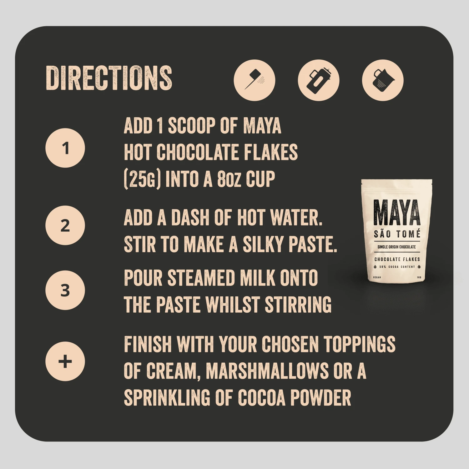 - Add 2 scoops of Maya hot chocolate flakes (30g) into a 12oz cup