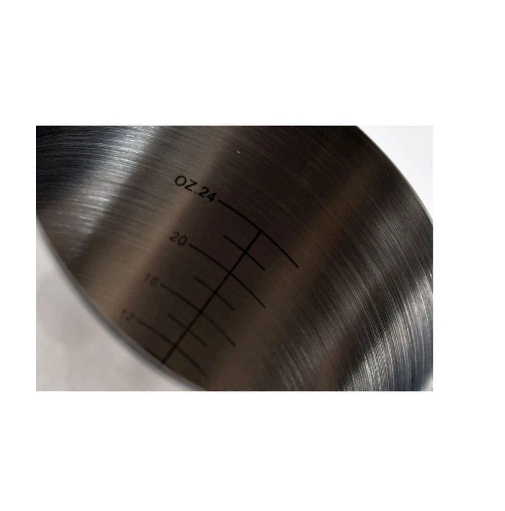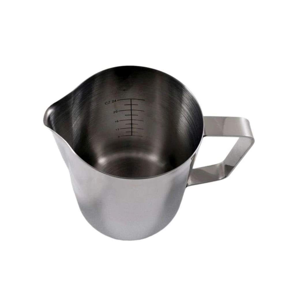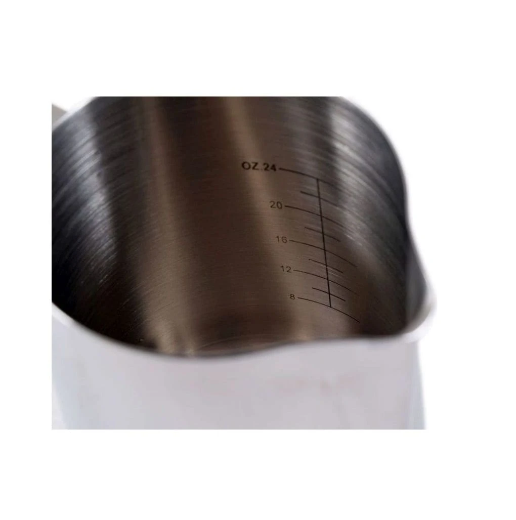 Professional quality straight sided foaming jug with lined measurements etched on both sides for right and left handed milk frothing, improved accuracy and less wastage. Narrow spout for superior pouring control and latte art